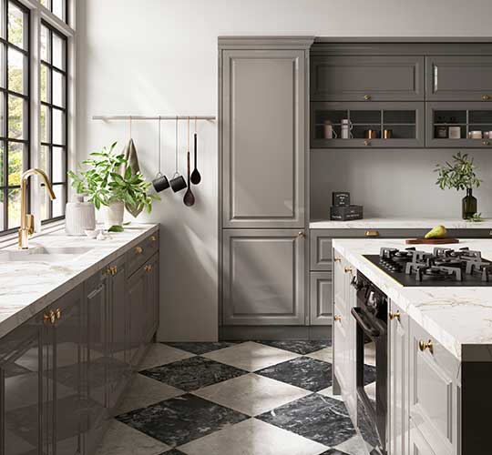 Eingerahmte Türen, vertikale Linien, die den Stil verstärken, helle und großzügige Farboptionen bringen Ästhetik in Ihre Küche und sorgen für eine entspannte Atmosphäre.